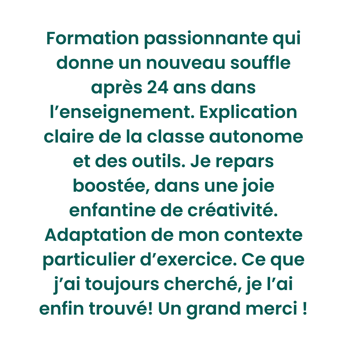 « Formation passionnante qui donne un nouveau souffle après 24 ans d’enseignement. Explications claires, outils concrets. Je repars boostée, avec une joie de créativité. Ce que je cherchais, je l’ai enfin trouvé ! Merci ! »