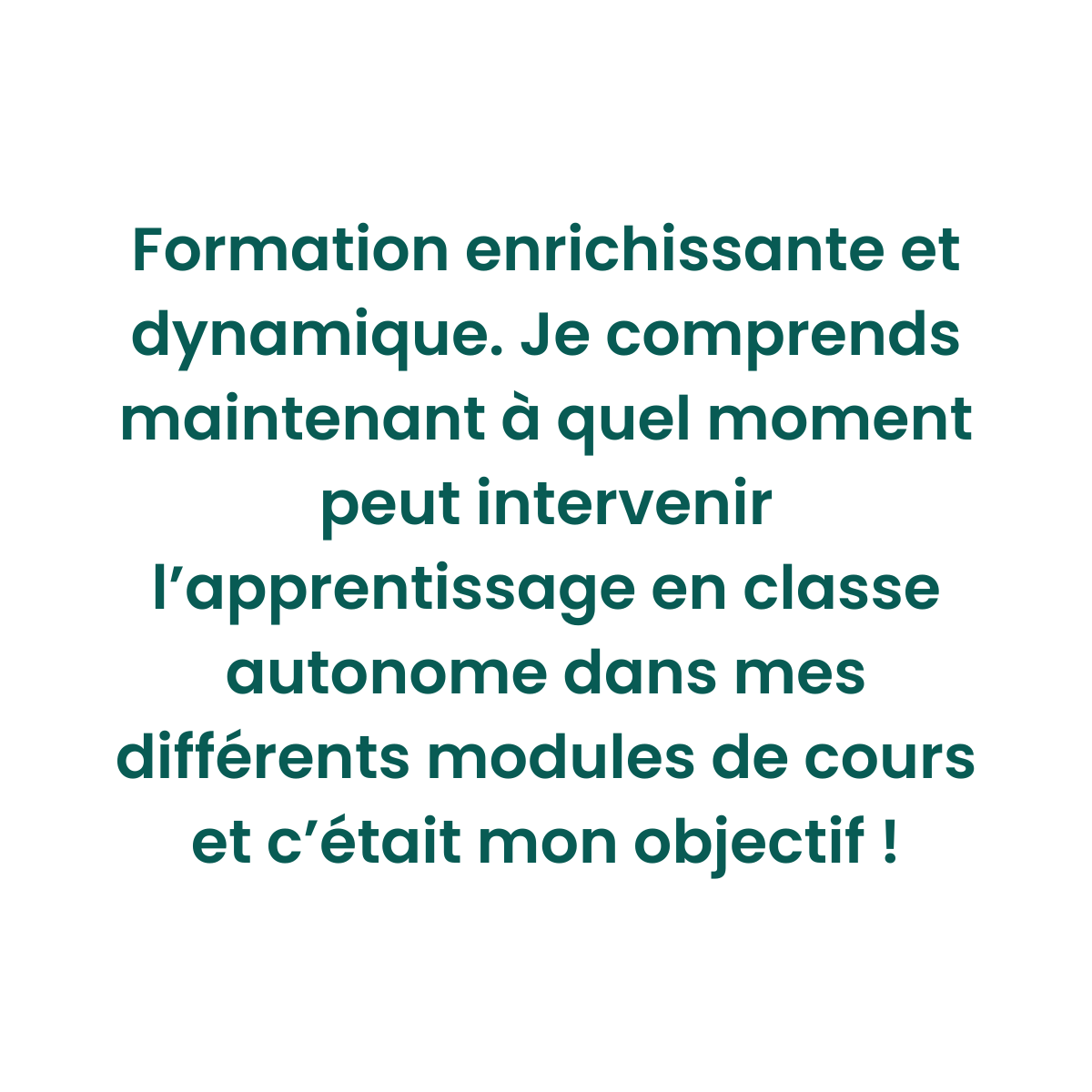« Formation enrichissante et dynamique. Je comprends maintenant à quel moment peut intervenir l’apprentissage en classe autonome dans mes différents modules : c’était mon objectif ! »